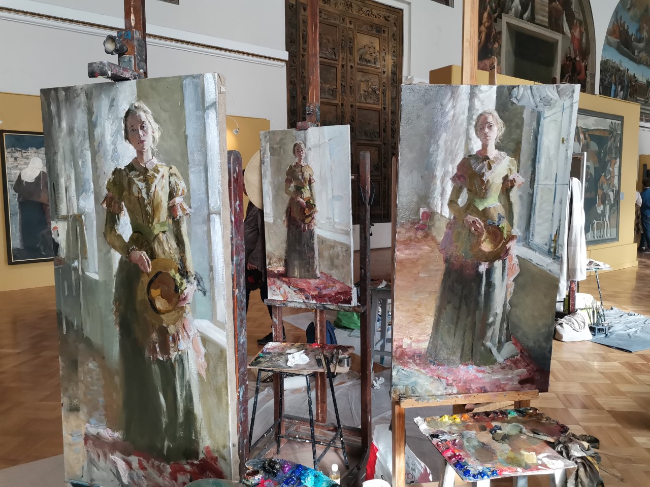 Vieraat kiertelivät katsomassa näyttelyä, ja me maalasimme kuten Ilja Repin aikoinaan.